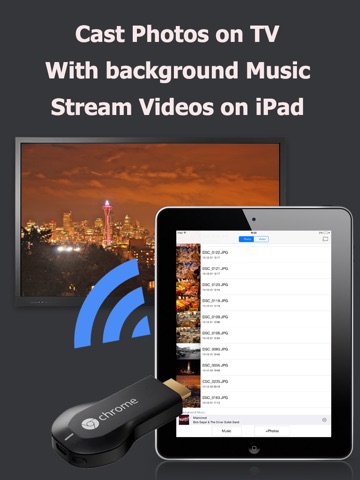 This app is dedicated for Chromecast, it can play photo slideshow with background music on bigger TV screen from your iPhone/iPad with Chromecast.
