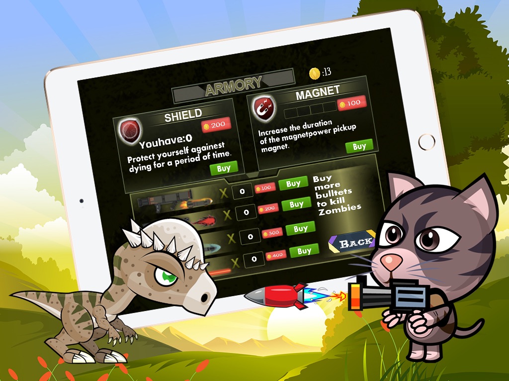 You control cat rangers to shoot dinosaur and zombies to pass level.
