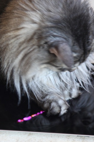 Put your camera-equipped iPhone, iPod touch or iPad on the ground (carpet works best) and watch your cat take self portraits! Cat Selfie shows a bouncing "flaming laser" ...cats love chasing lasers! Cat Selfie takes a photo every time your cat touches the screen.