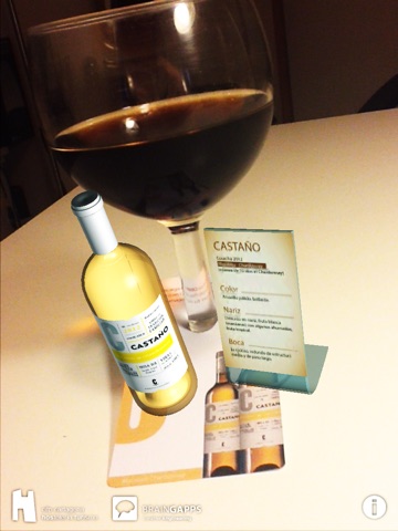 Esta app de Realidad Aumentada muestra la botella y nota de cata sobre etiquetas colocadas en el pie de cada copa (target). Puede ver y imprimir dichas etiquetas desde http://CataAR.braingapps.com.