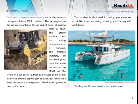 The Catamaran Sailing Confidence Clinic is presented in three modules with interactive multimedia animations and highly colorful images from our sponsor and proponent, Lagoon Yachts.