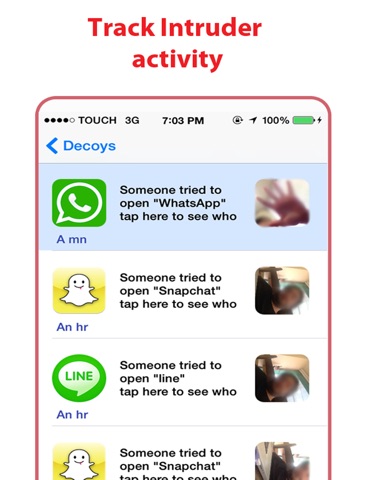 An app decoy can take any shape and form to trick your intruder, and may be placed anywhere on your Phone. The unsuspecting intruder will tap on it thinking its just another app and will be secretly photographed and reported back to you. Create as many Decoys as you want!