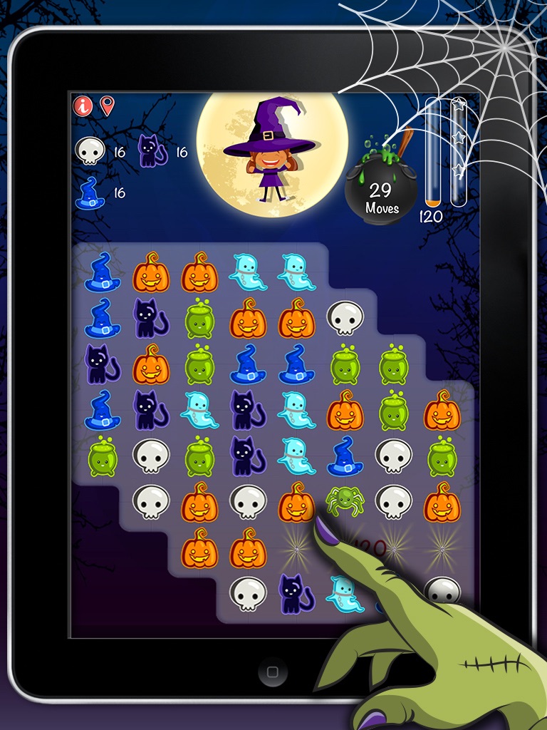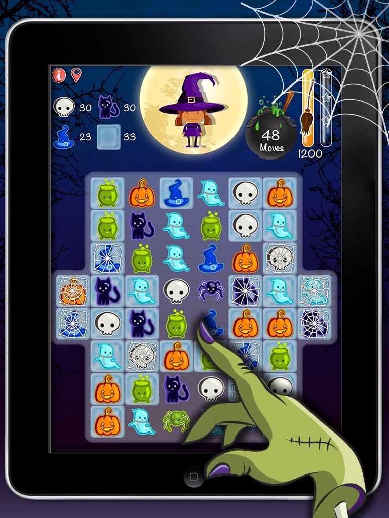 Your adventure will take place at different levels or stages. The game is to collect candy or sweets is the same color and to achieve the objectives presented in each of the levels available. Collect as many Halloween figures and get powers or power-ups that will help you solve the problem and pass these levels with ease. The starting point is the map of the cemetery with all levels or worlds.