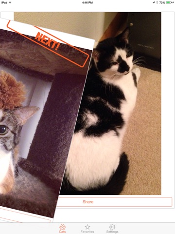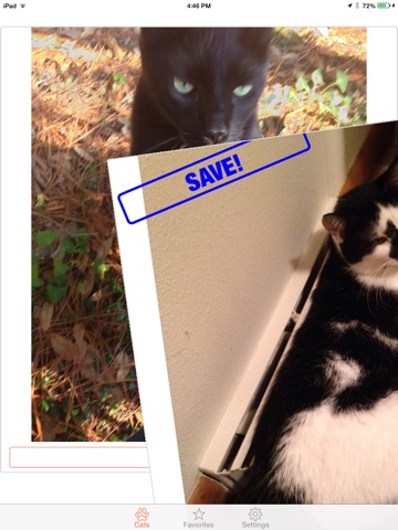 CatSwipe, for all of your cat swiping needs. Fill your addiction by viewing an endless supply of cats. Swipe right to save a cat to your favorites for future viewing pleasure, or swipe left on lesser cats to continue browsing better cats! Find a cat so impressive you want to share it with the world? Weve got you covered. Share on Facebook, Twitter, email, text, or even your own printer! Cats can also be saved right to your photo library. Dont waste your time searching around the internet for your cat fill. Check out CatSwipe today, and swipe until your heart is content.