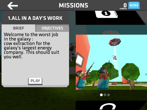 -20 hand-crafted levels with different objectives each! Abduct cows in the countryside, steal a nuclear missile in the canyons, square off against a gigantic experimental tank!