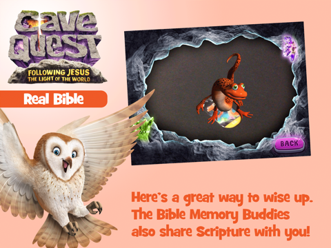 Just tap the screen and watch them go. The Cave Quest Bible Memory Buddies are a fun way to learn God’s word and share it with your friends. Each of the five Buddy Tags will trigger a different Bible Memory Buddy.