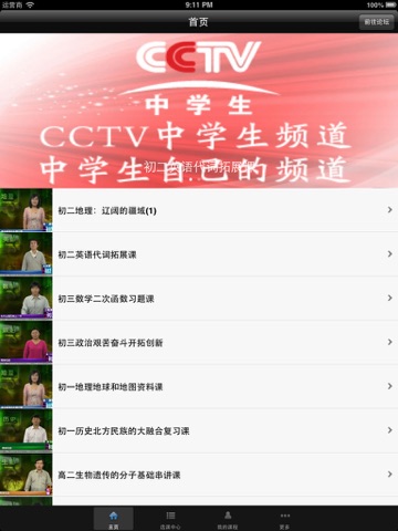 频道全面关注中学生成长。频道内容以中学生课程辅导为主。频道精选全国中学教师中最具代表性的名校名师,首次将优秀教师及其教学方法在央视媒体平台上汇集成为优质远程教育资源,是对当代中学教师教学技能和风采的空前展示和观摩巡礼。