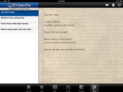 The notes section of the app provides a convenient place for installers to record information on installation projects they are working on.