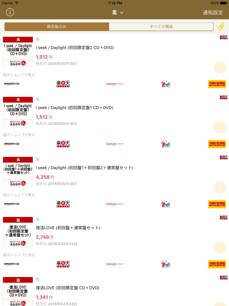 例えば、嵐と関ジャニだけお知らせを受け取るといった設定も可能です。好きなグループの発売情報だけが受け取れます。