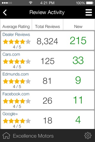 · Access ratings and reviews from top online review sites like: Google +, Yelp, Facebook, Cars.com, Edmunds.com, DealerRater* (requires DealerRater solution)