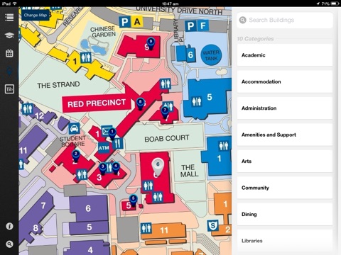 - Pinpoint your current location on campus, search for campus buildings and check opening hours. Find places to eat, student accommodation, academic programs, support services and more.