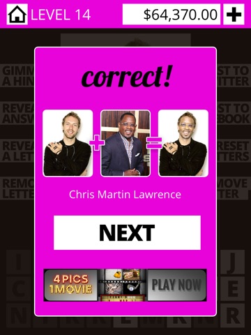If you get stuck, you have lots of options for help. You can post the Celebrity Smashup to either Facebook or Twitter and ask your friends for help. You can also use coins that youve collected to buy level helps. These helps are Reveal A Letter, that shows you the next letter in the answer, Remove Letters, that removes all unused letters from your rack set, Gimme A Hint, which allows you to buy a clue that gives you a hint about each of the two celebrities in the pair, and finally, Reveal The Answer, the shows you the answer and lets you skip the level, if youre really in a bind.