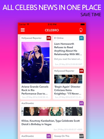 By default our app shows RSS news feeds by most popular and reputable sources in celebrity news world.