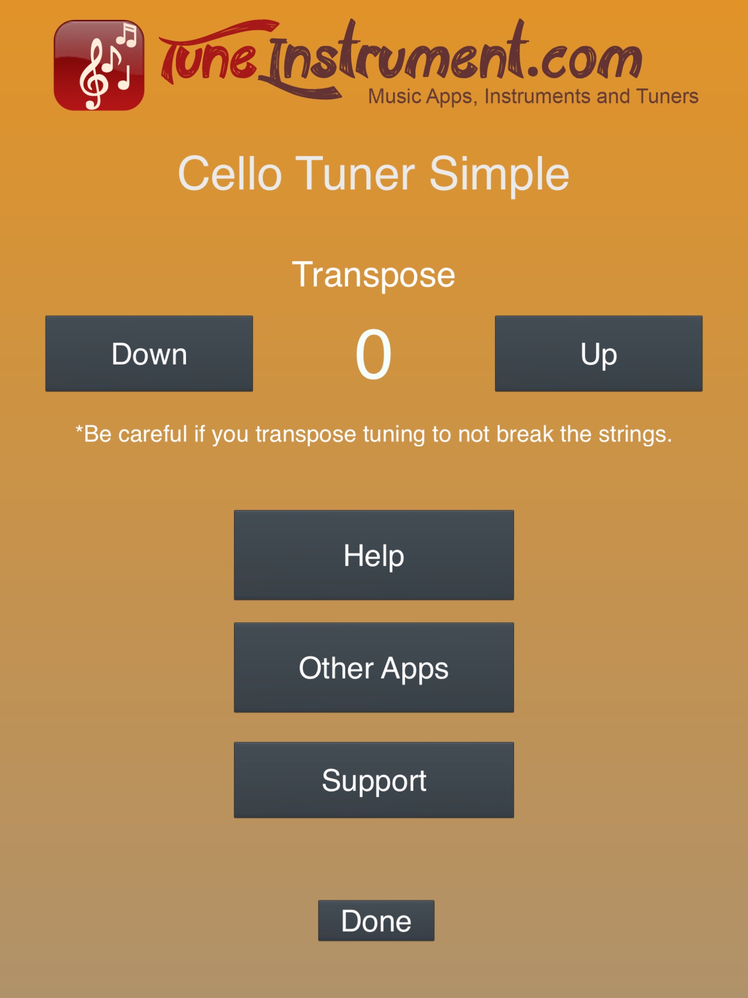 If you need to tune other instruments just simply have a look into our other applications: Violin Tuner Simple, Banjo Tuner Simple, Mandolin Tuner Simple, Double Bass Tuner Simple, 12-String Guitar Tuner Simple, Viola Tuner Simple, Guitar Tuner Simple, Ukulele Tuner Simple, Bass Tuner Simple, Dulcimer Tuner Simple, Dulcimer Tuner Simple Mixolydian, Dulcimer Tuner Ionian, Balalaika Tuner Simple.