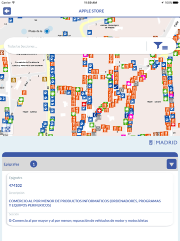 La aplicación facilita la consulta de la información existente en el Censo de Locales y Actividades del Ayuntamiento de Madrid y se pueden utilizar diversos criterios de selección, como la localización geográfica, búsquedas por Rótulo de la actividad o por tipo de actividad.
