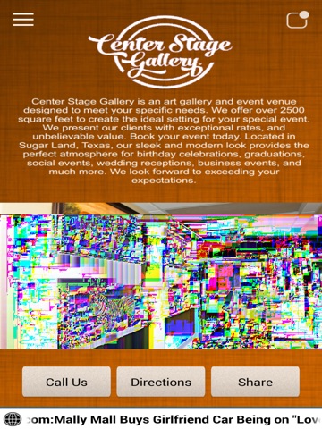 We would like to welcome you to the official app of Center Stage Gallery. Center Stage Gallery is an art gallery and event venue designed to meet your specific needs. We offer over 2500 square feet to create the ideal setting for your special event.