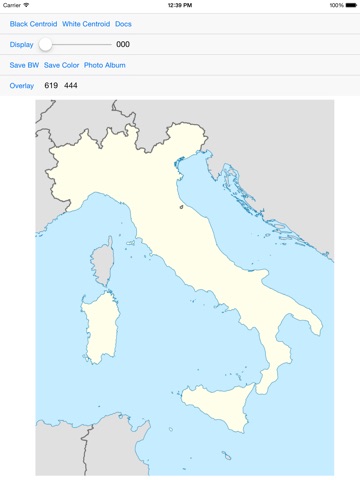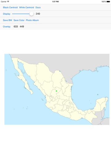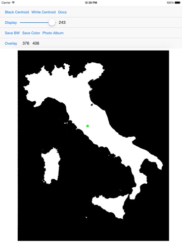 Finds the 2D centroid of an image loaded from the library. Upload a photo to find the centroid. The image must be converted to black and white in order to alter the threshold values, so using images with a little color and high contrast gives best results. Images may need to be modified before using the app.