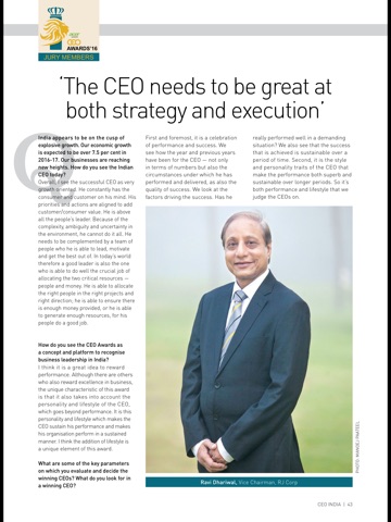 CEO India is a monthly lifestyle magazine, capturing life, views and philosophies of the CEOs and top-level management professionals, who are some of the finest in our country. Besides in-depth interviews with the CEOs and senior professionals, CEO India has sections on health, an investment guide, technology trends and culture. CEO India has it all--business strategy, savoir-faire and glitter.