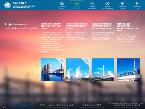 Among subsidiaries of State Grid Corporation of China (hereafter referred to as SGCC), China Electric Power Equipment and Technology Co., Ltd. (hereafter referred to as CET) is the only one conducting the general contracting. It is the first time that CET launches the application platform for business presentation to display the six modules consisting of SGCC, CET, Business Scope, Technological Edge & Capability, Achievements and Our Team digitally and graphically, thus contributing to better understanding of CET by our owners, partners and peers.