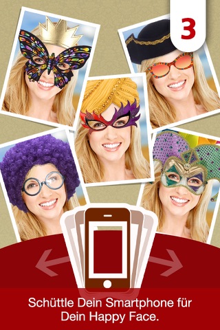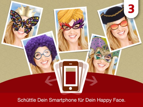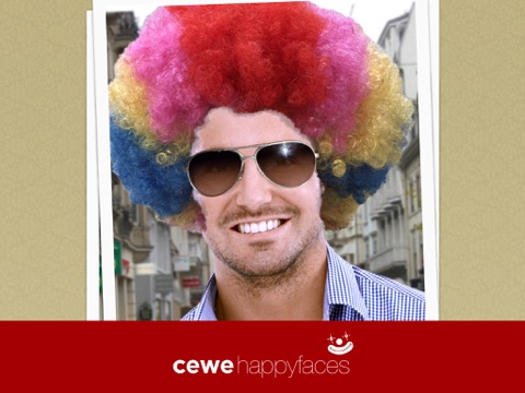 Sorgen Sie mit CEWE Happy Faces für gute Laune, indem Sie Ihr Gesicht oder das Ihrer Freude mit lustigen Masken, Brillen, Hüten usw. versehen. Machen Sie schnell ein Foto, oder nehmen Sie ein Bild aus Ihrem Album, wie sehen Ihre Freunde z.B. mit roten Nasen und einer Brille aus? Hunderte von verschiedenen Möglichkeiten sorgen für einen tollen Spaß – einfach ihr Smartphone schütteln und schon erscheint eine neue lustiges Variante.