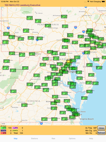 PURPOSE: The Area Weather App is used to check METARs and TAFs plotted on a color-coded map, an enhanced text table or in raw data format. The weather is displayed for all METAR stations within the specified area. The area is defined by a METAR station and a radius around the station.
