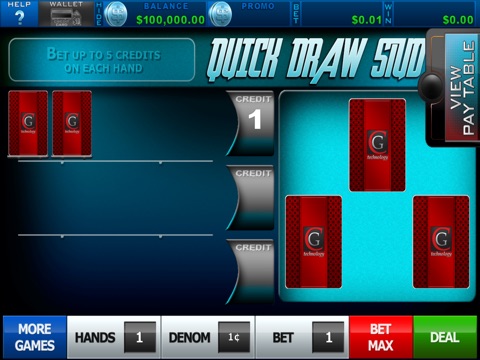 Quick Draw Stud® - An exciting and unique 5 card video poker game that allows the patron to build their poker hand! The patron is dealt 2 cards face up, and then allowed to select their next 3 cards for their hand from a selection of cards shown.