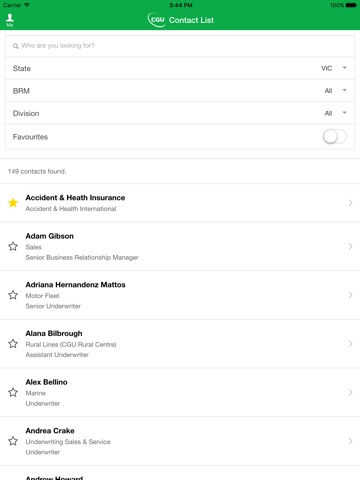 The Contact List enables partners to filter via state, business relationship manager and division for a refined list of contacts or search for a specific contact using the search feature. A list of favourites can also be created for commonly used contacts.