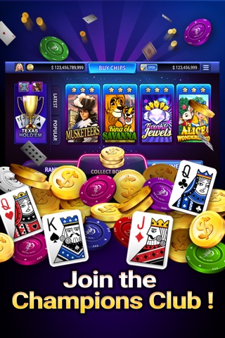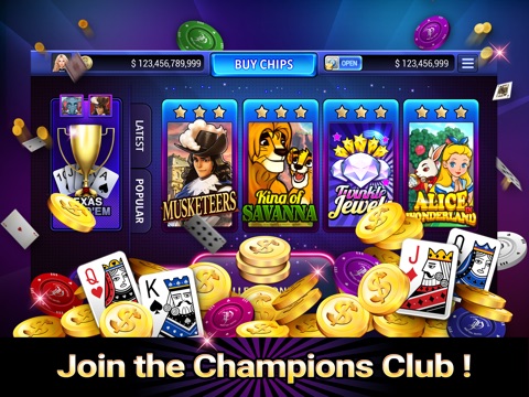 Champions Club Casino offers thrilling BIG WIN experience in Slots and Texas Hold’em Poker. Relax in social arena and get lucky to win the prestigious champion title.