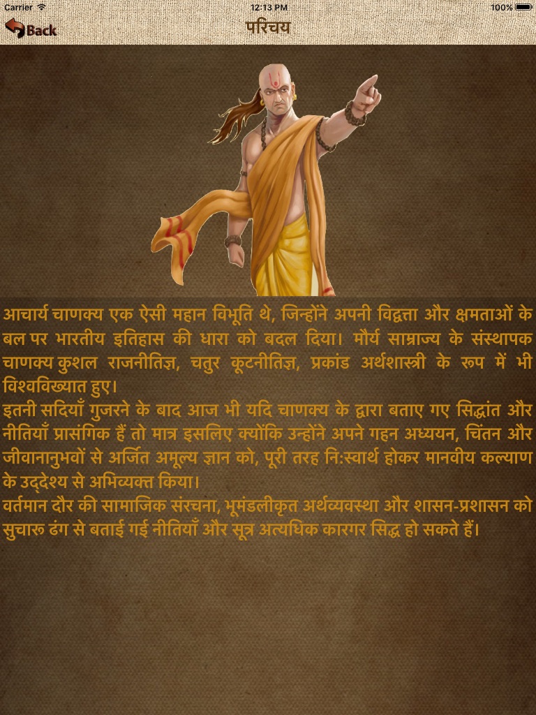 App includes thoughts of The Great Chanakya. It is in Hindi language.