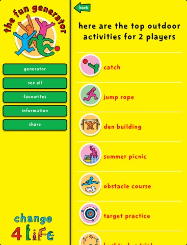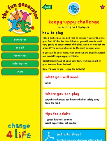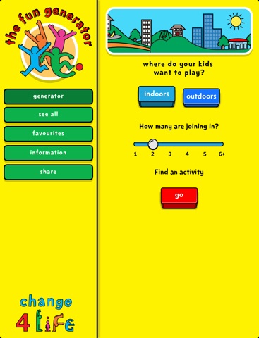 The Change4Life fun generator app is packed with over 100 fun activities for your kids to enjoy, indoors and out. There’s something for everyone - outdoor games for big groups such as dodgeball or tug of war, and indoor activities like ice lolly making and homemade instruments. So start exploring – and enjoy your adventures!