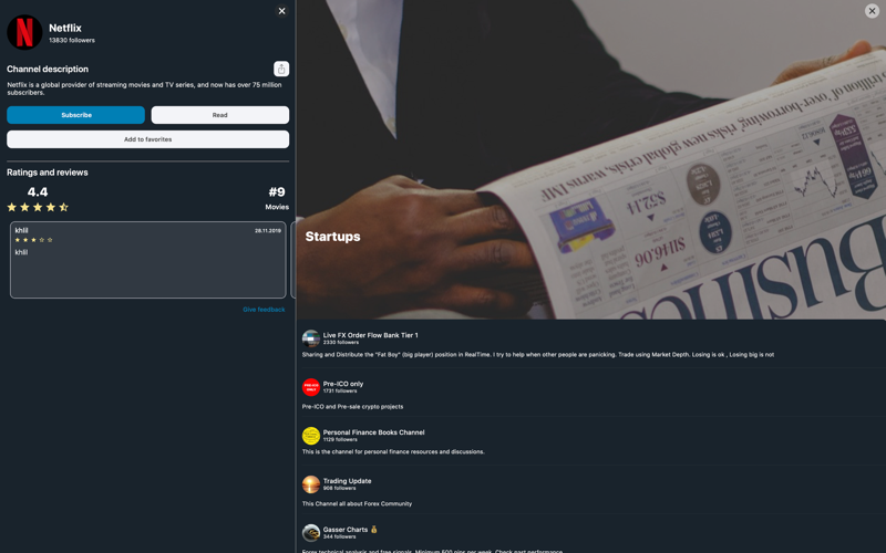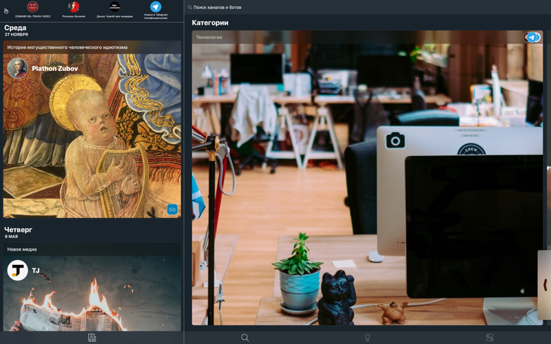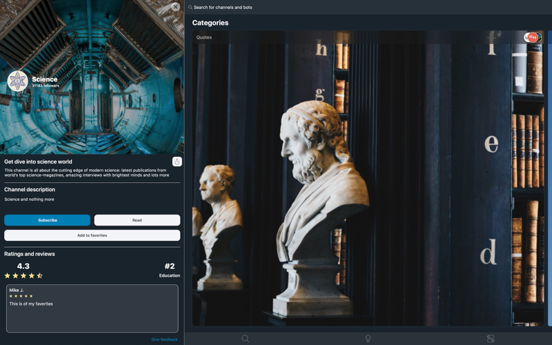 Search by channel names is available to you, and with division into categories you can easily find channels on topics you are interested in.