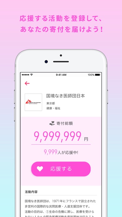 応援する社会貢献活動を行う団体を選択、各団体のページで「応援する」で選択してください。応援団体は常時一つのみ選択でき、いつでも変更可能です。