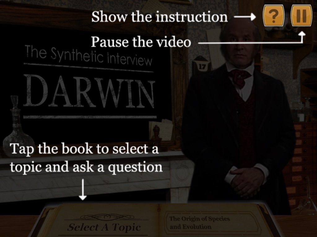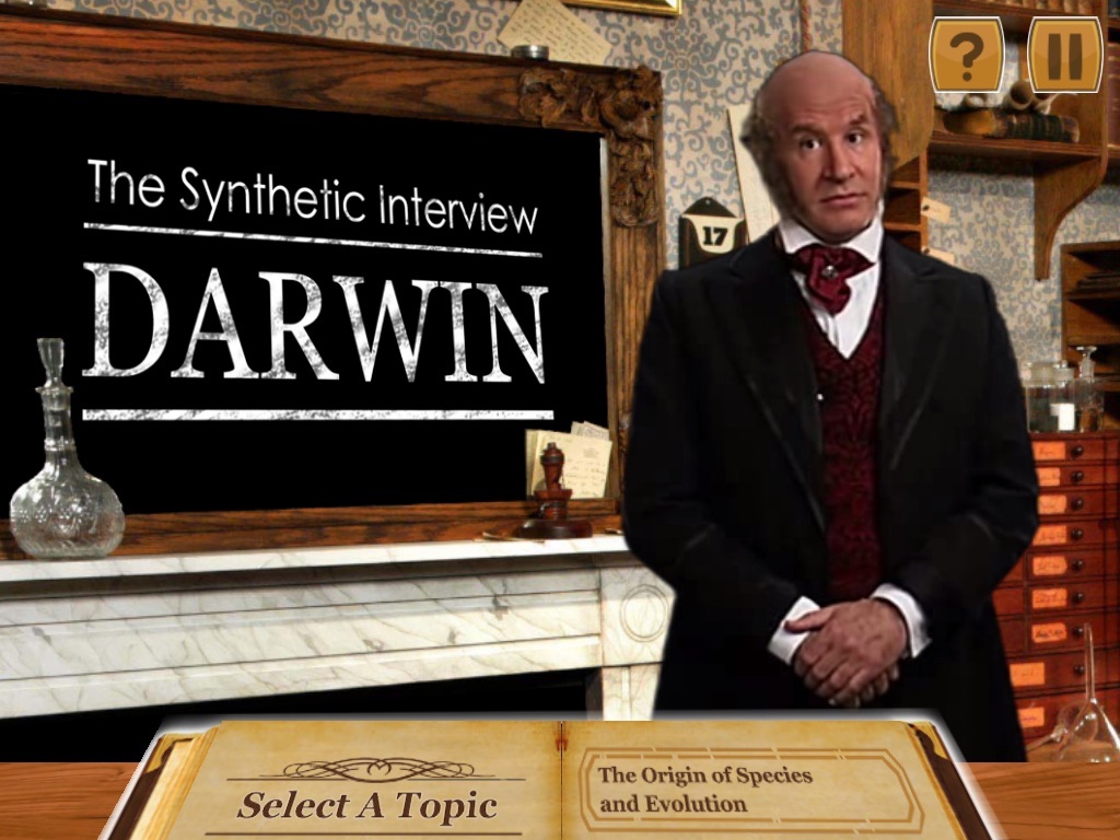 Charles Darwin, the naturalist, geologist, and leading contributor to the fundamental principles of Evolution, comes alive through synthetic interview technology. Duquesne University biology professor John Pollock collaborated with Carnegie Mellon Universitys Entertainment Technology Center (creator of the Synthetic Interview technology) to develop an interactive experience in which users to select from a list of questions to ask the virtual Darwin, portrayed by Pittsburgh actor and Carnegie Mellon drama alumnus Randy Kovitz. Questions cover Darwins adventures, the principles of evolution, the public response to his discovery, his childhood, personal quirks and a number of other topics. More than a dozen modern-day biologists, religious authorities, an ACLU lawyer and other experts provide modern commentary and answer questions beyond Darwins 19th century knowledge.