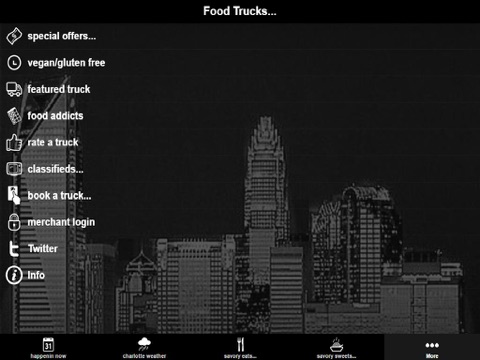 happenin now, charlotte weather, savory eats..., savory sweets..., special offers..., vegan/gluten free, featured truck, food addicts, rate a truck, classifieds..., book a truck..., merchant login