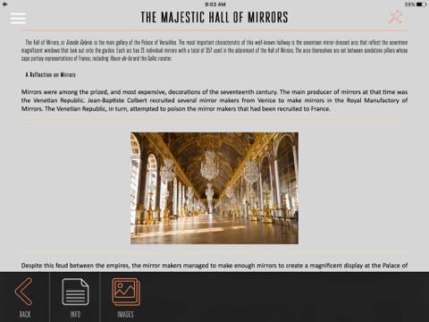 Gives you nothing without spending $2 for each subject area and there is nothing that is not available on the Versailles website. Dont waste your money. Get the Happy Versailles and the Palace of Versailles gardens and chateau apps. They are actually free with way more info!