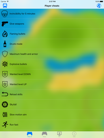 To see a cheat, you press the name of the cheat and you will see an animation of the buttons. PC will show a keyboard code and a phone number.