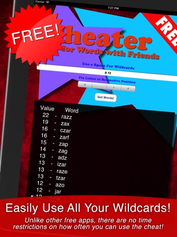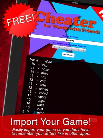 Cheater for Words with Friends is the best app for winning in Words With Friends. Simply enter your letters and get back the best words sorted from highest value to lowest, in seconds!