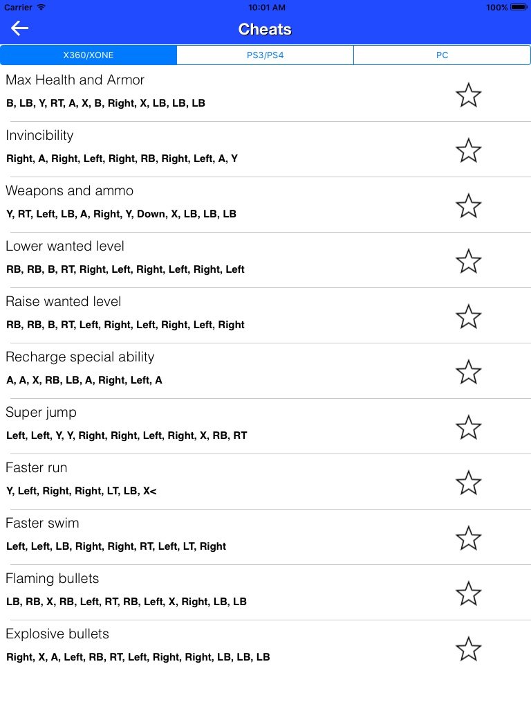 You can easily add the selected codes to FAVOURITES, which will make the most important codes handy. The codes work on all platforms (XBOX360, Xbox One, PlayStation 3, PlayStatin 4, PC).