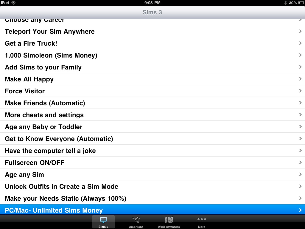 NOTE: This app is designed for iPhone, iPod Touch, and iPad but most cheats are for PC/Mac.