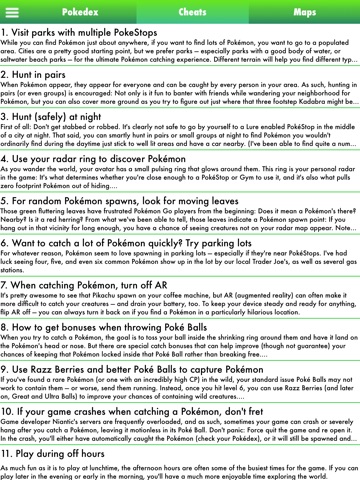 Pokemon with description, Cheats with the latest tricks, Maps with PokeStops and Gyms.