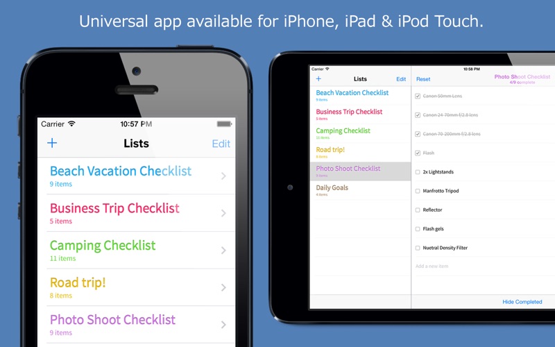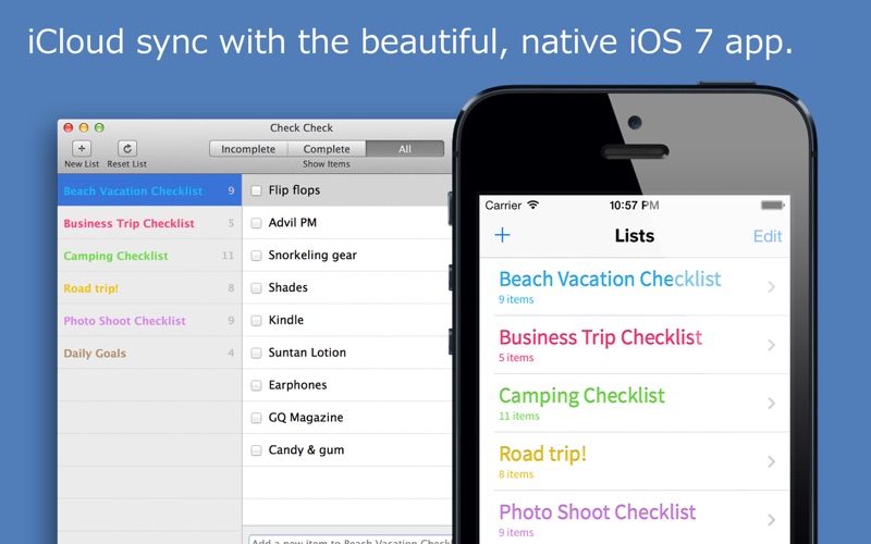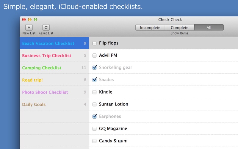 A simple iCloud-enabled app to manage all your checklists. Use it for things like travel packing lists, daily tasks, home inspections, gear to bring to a photo shoot, grocery lists and so much more.