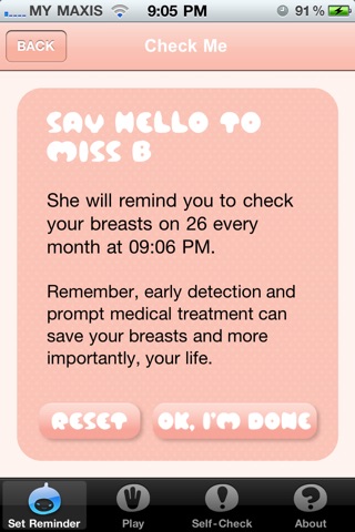 Check Me is an app offered by the Breast Cancer Welfare Association Malaysia (BCWA). It introduces a lovely character called Miss B, who will remind you to check your breasts every month. Just set your preferred time and date for Miss B to send you an email every month, and you’ll always remember your monthly date with your beloved assets – your breasts!