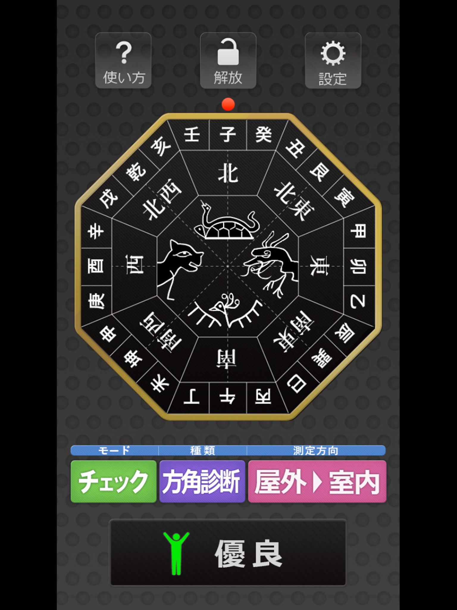 方角を示すだけの一般的な方位計アプリとは異なり、診断結果を「優良」・「良好」・「普通」・「不良」の4段階で自動判定する点に特徴があります。