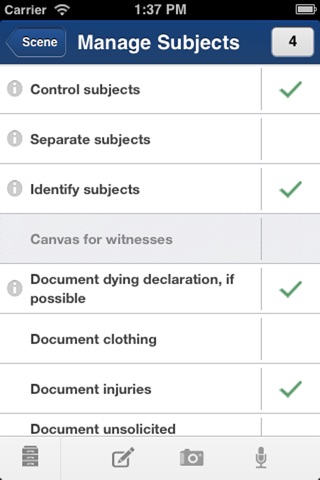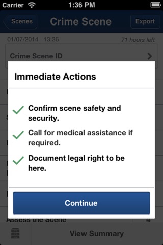 This app is for first responding officers. It is neither intended for nor should be used to replace crime scene processing units. Additionally, all departmental, jurisdictional, and governmental policies and procedures should supersede app checklist procedures.