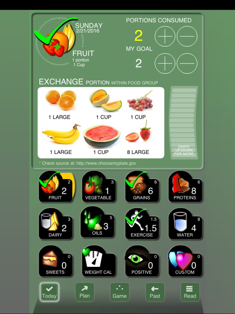 Important note: Please be aware that the main focus of this App is on balanced portions by food group and keeping track daily portions consumed. Make sure to swipe the scroll bar on the right to show more exchanges for the food group that you are looking at.