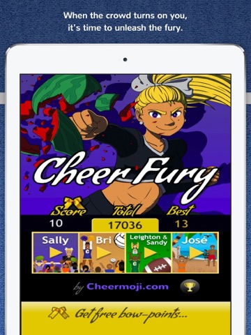 Save the cheerleader! In Cheer Furys first level, youre Sally, who dropped all her stunts so the crowds throwing fruit at you! Youll have to unleash your fists of fury with sharp motions and high tucks to defend yourself.