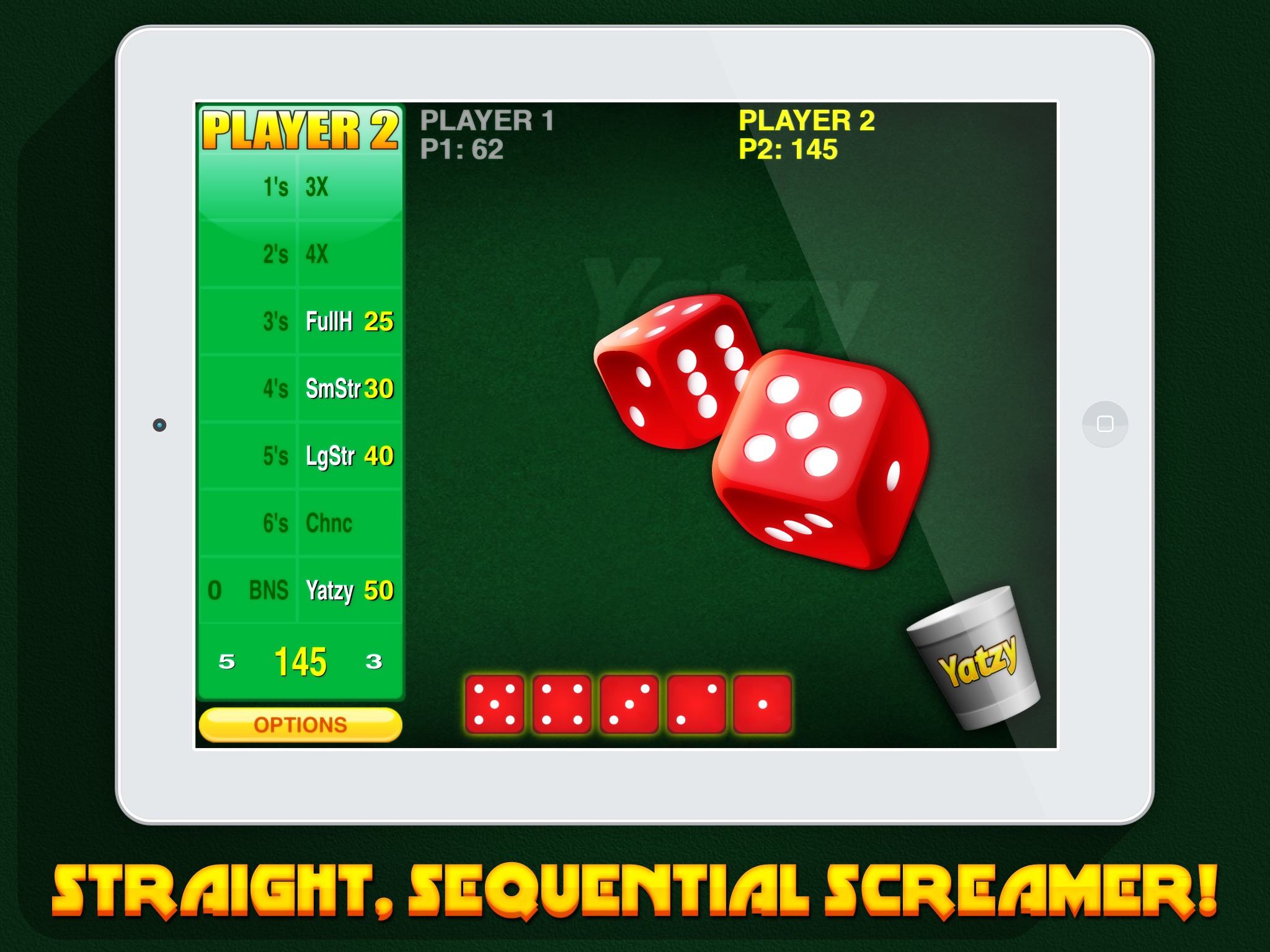 Test your skills in 13 rounds, with 3 rolls per hand. Winner scores by creating the best poker hand: 3 of a kind, 4 of a kind, straights, and so on…