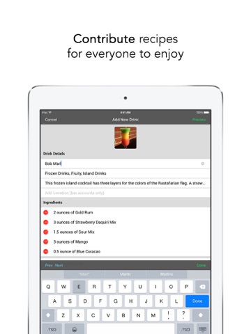 Its an entire cocktail book in your pocket. The design and layout of this app is so far ahead of every other cocktail app. Without an account its a great cocktail resource, with an account (linked through Facebook) it lets you share drinks with your friends, track what you like, and save a bar stock for recommended drinks. Highly recommended!