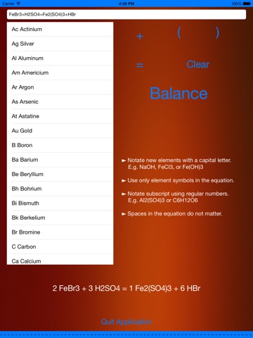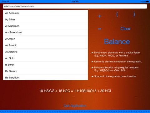 You can input unbalanced equations using the supplied list of elements and buttons and/or the keyboard on your device. The app will quickly produce a balanced equation for you. Done.
