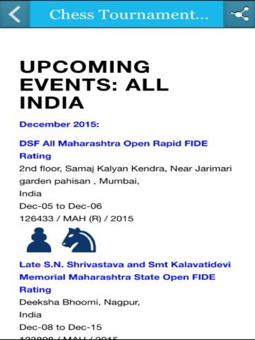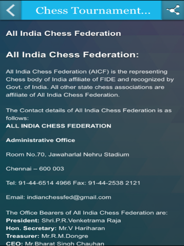 Chess Tournaments India is an informative app for chess players across India. Chess Tournaments App will bring up to date information on chess events, chess news for the benefits of chess players. There will be separate update for FIDE International events, National Level Events, State Level Events inside the App. All State Level chess information such as associations their calendar of events are provided for easy access of information.